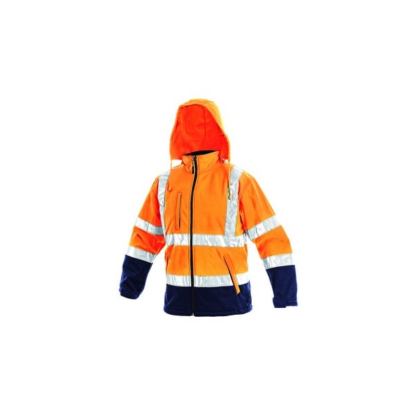 Výstražná, softshell bunda, odolná proti vodě a větru, odepínací kapuce, rukávy zakončené regulovatelnou manžetou, TPU membrána, odolnost materiálu proti průniku vody 8 000 mm mimo oblast švů, paropropustnost 1 000g/m2/24 hod.