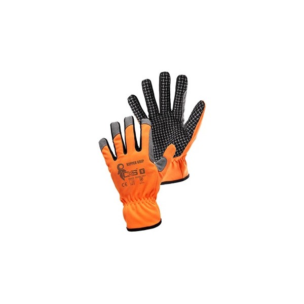 Kombinované rukavice, hřbet z polyesteru, dlaň a prsty z mikrovlákna, pokryté silikonovými body, v zápěstí gumička, konce prstů v hřbetní části a oblast mezi palcem a ukazováčkem vyztužena viskozou (syntetický kůže).